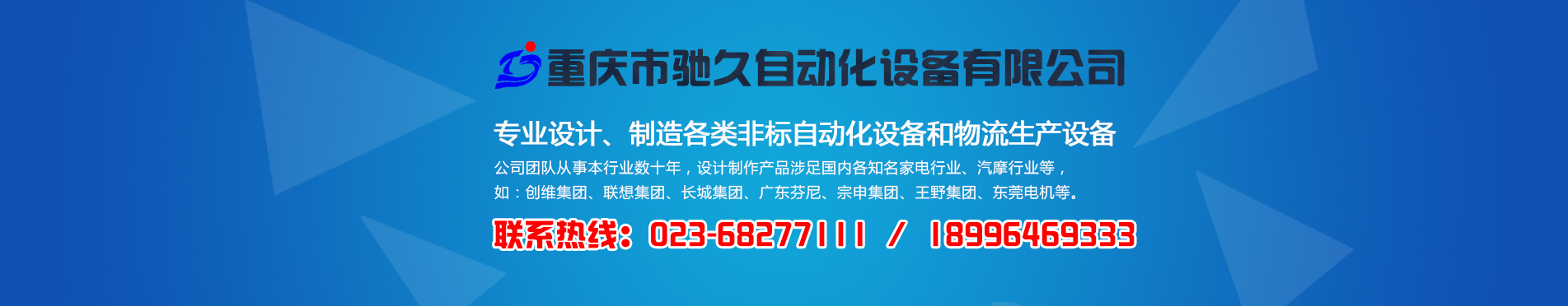重慶市馳久自動(dòng)化設(shè)備有限公司是一家專業(yè)設(shè)計(jì)、制造各類非標(biāo)自動(dòng)化設(shè)備和物流生產(chǎn)設(shè)備的綜合性企業(yè)。 公司以“馳而不息,久而彌篤”為發(fā)展理念,堅(jiān)持“憑誠信獲市場,靠質(zhì)量得效益”的企業(yè)宗旨,不斷創(chuàng)新理念,持續(xù)發(fā)展技術(shù),為客戶提供滿意的自動(dòng)化物流系統(tǒng)解決方案和非標(biāo)自動(dòng)化設(shè)備。 公司生產(chǎn)基地坐落在重慶市北碚區(qū)歇馬鎮(zhèn)天馬村,占地面積約5000平方米。公司擁有先進(jìn)的加工設(shè)備,配套激光切割機(jī)、數(shù)控剪板機(jī)和折彎機(jī)等;同時(shí)擁有自動(dòng)涂裝生產(chǎn)線。 公司團(tuán)隊(duì)從事本行業(yè)數(shù)十年,設(shè)計(jì)制作產(chǎn)品涉足國內(nèi)各知名家電行業(yè)、汽摩行業(yè)等,如:創(chuàng)維集團(tuán)、聯(lián)想集團(tuán)、長城集團(tuán)、廣東芬尼、宗申集團(tuán)、王野集團(tuán)、東莞電機(jī)等。 [ 了解更多 ]
